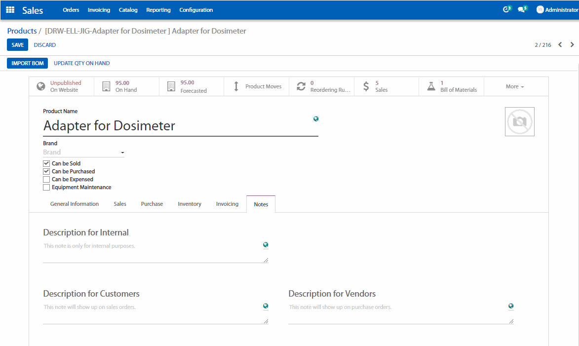 Có thể thêm thông tin riêng cho sản phẩm trên báo giá. Để thêm thông tin cho sản phẩm vào phân hệ Sale (Bán hàng) > Catalog (Danh mục) > Products (Sản phẩm) > Chọn sản phẩm đã có hoặc tạo mới sản phẩm theo yêu cầu nếu cần. Nhấn vào form sản phẩm được chọn, sau đó click Edit (Chỉnh sửa).