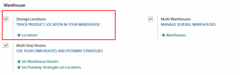 Để cho phép thay đổi địa điểm trữ hàng hỏng bằng wizard thì bạn phải chọn Storage Locations (Các địa điểm kho) trong cài đặt Inventory (Tồn kho) > Configuration (Cấu hình) > Setting (Thiết lập).