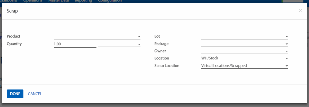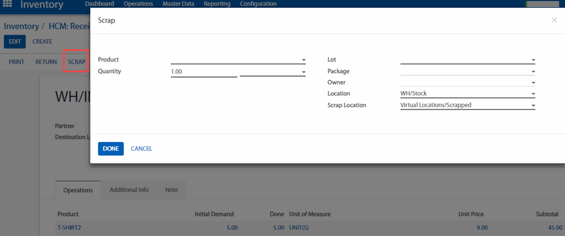 Khi bạn nhấp vào nút scrap, một cửa sổ popup sẽ xuất hiện. Bạn có thể nhập vào số lượng sản phẩm và quy định địa điểm trữ hàng hỏng, sau đó nhấp vào DONE (HOÀN THÀNH).