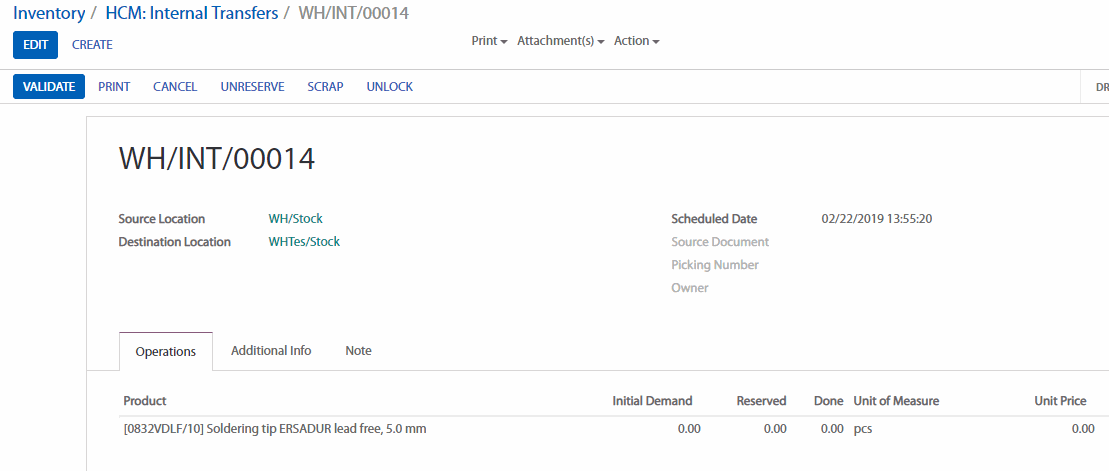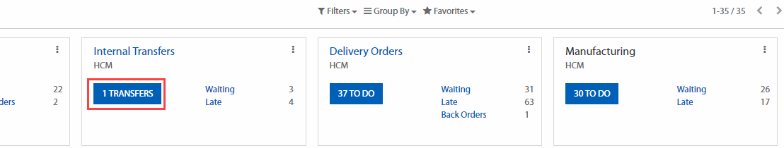 Để bỏ sản phẩm hư hỏng trong khi luân chuyển nội bộ thì đi đến Inventory (Tồn kho) > Dashboard (Bảng thông tin) > Internal Transfers (Dịch chuyển nội bộ)
