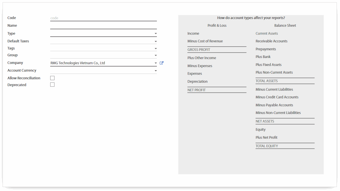Loại hình tài khoản được tự động tạo ra khi cài đặt hệ thống tài khoản kế toán. Theo mặc định, phần mềm cung cấp nhiều hệ thống tài khoản kế toán, điều duy nhất cần làm là thiết lập tài khoản tương ứng với quốc gia của bạn.
