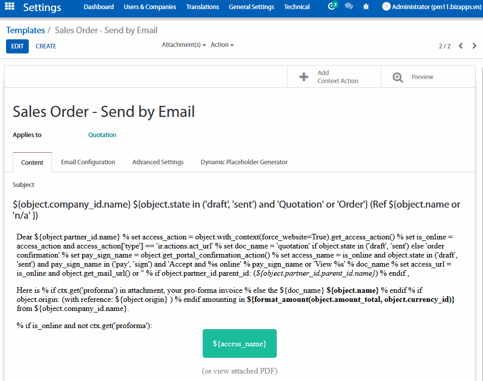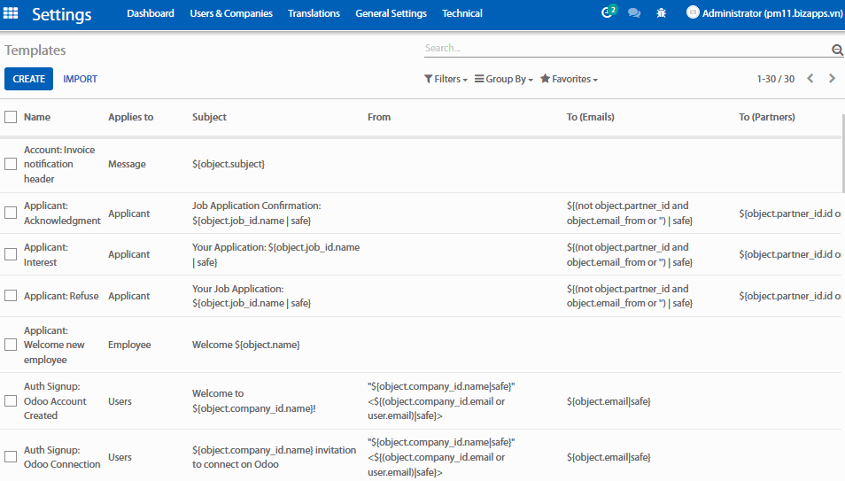 Odoo cho phép bạn tạo ra các mẫu email bằng cách sử dụng menu Settings (Thiết lập) > Technical (Kỹ thuật) > Template (Mẫu thư điện tử ).