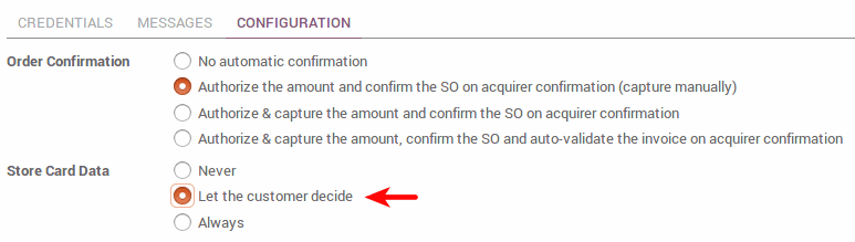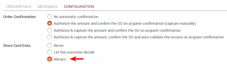 Để khách hàng cũ dễ dàng thực hiện thanh toán, bạn có thể để họ giữ và sử dụng lại thẻ tín dụng nếu họ muốn. Như vậy, một mã thông báo thanh toán sẽ được lưu ở Odoo. Tùy chọn này có sẵn với Ingenico và Authorize.net.