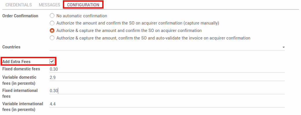 Để kích hoạt tính năng này, hãy chuyển đến cửa sổ Configuration của cấu hình Paypal trong Odoo và nhấp chuột chọn Add Extra Fees . Phí mặc định cho Hoa Kỳ có thể xuất hiện dưới đây.
