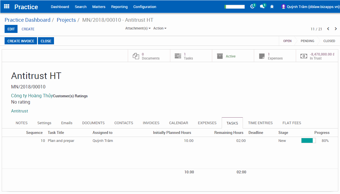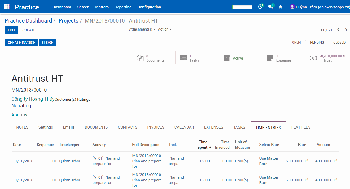 • Activity: Tên công việc, hệ thống hỗ trợ các đầu thông tin công việc ghi timesheet được chuẩn hóa giúp cho luật sư ghi timesheet được nhanh hơn.