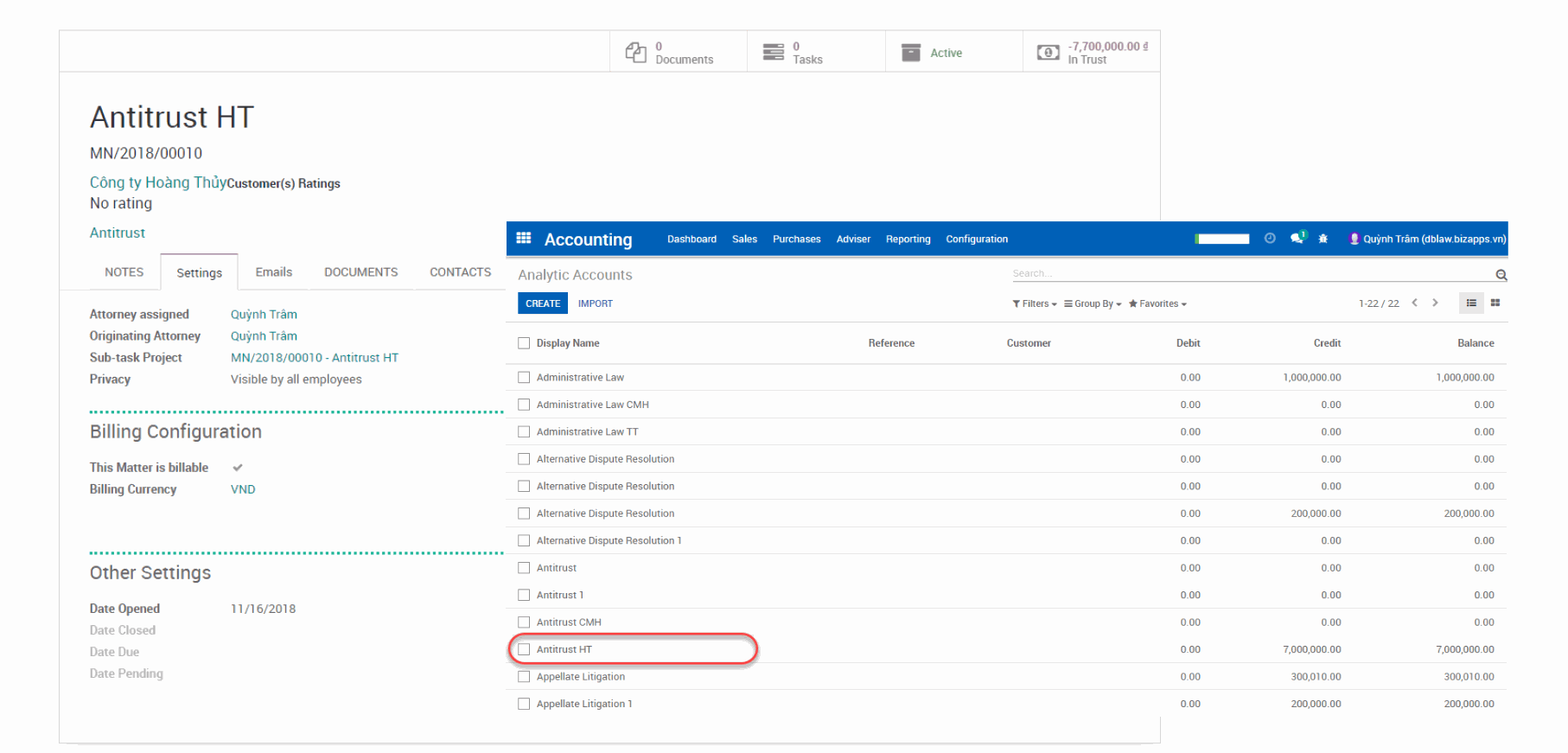 Mỗi “Matter” được tạo ra hệ thống sẽ tự động tạo một “Analytic Accounts” cho phép bạn theo dõi chi phí và doanh thu từ mỗi vụ việc (menu Accounting > Configuration > Analytic Accounts).