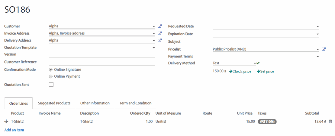 Bạn có thể chọn Delivery (Phương thức giao hàng) ngay trên đơn đặt hàng bán hàng sau đó nhấn Check price (Kiểm tra giá). Nếu bạn muốn hóa đơn vận chuyển trên đơn bán hàng. Nhấn vào Set price (Đặt giá), đơn hàng sẽ thêm một dòng với tên là phương thức vận chuyển như là một sản phẩm trong đơn hàng.