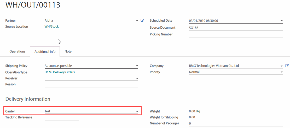 Trong phiếu giao hàng, chọn trường Delivery Information (Thông tin người vận chuyển). Người vận chuyển đã được chọn cho phương thức giao hàng.
