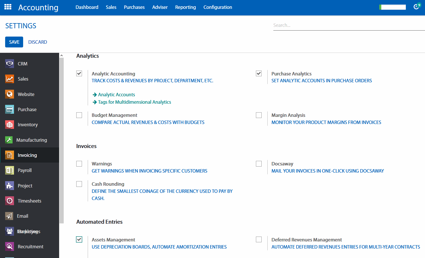 Để kích hoạt tính năng quản lý tài sản, bạn vào Accounting (kế toán) > Configuration (cấu hình) > Settings (thiết lập) > Features (tính năng) check “Assets managerment”, chọn Save (Lưu).