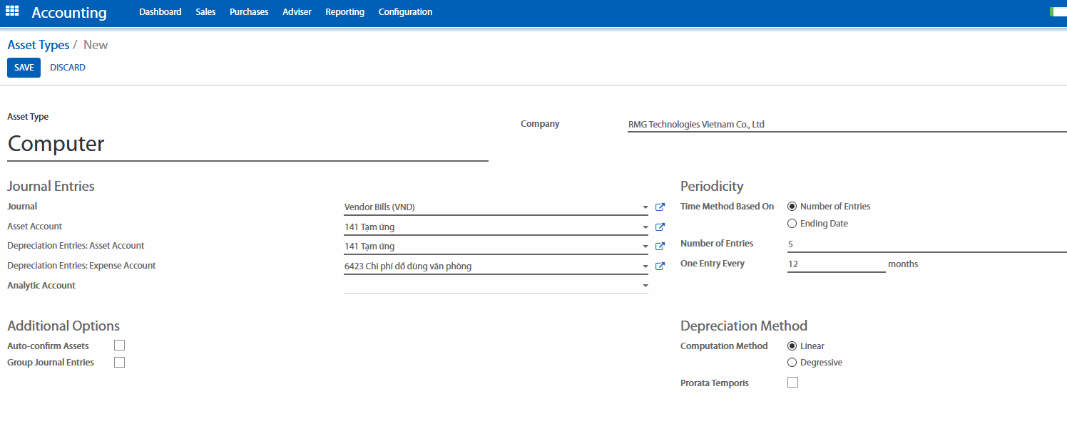 - Computation method (phương pháp tính khấu hao): bạn có thể chọn Linear (đường thẳng) hoặc Degressive (lũy kế)