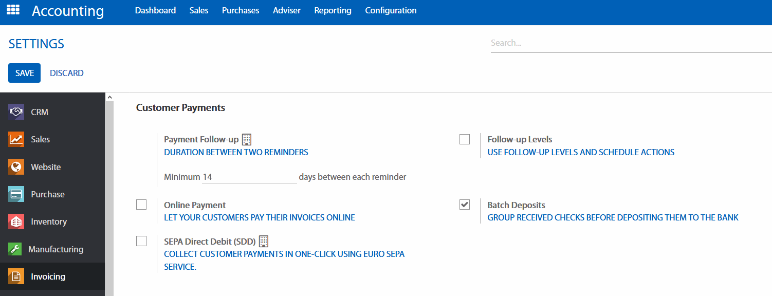 Để xác nhận tính năng Batch Feature đã được cài đặt, vào Configuration (Cấu hình) > Settings (Thiết lập) trong ứng dụng kế toán, kiểm tra tính năng: Batch Deposits.