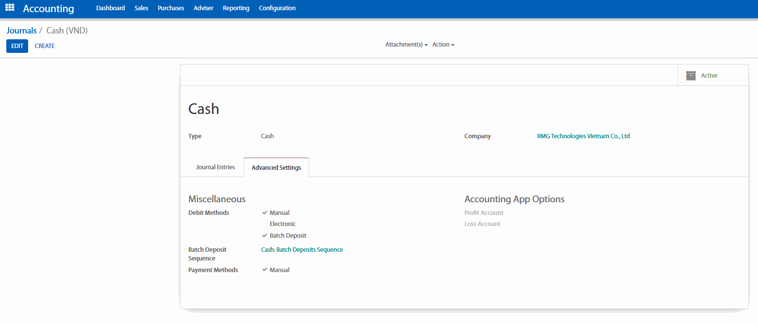 Để quản lý tài khoản ngân hàng nào có thể thực hiện việc kí gửi tiền và tài khoản nào không thể, bạn hãy vào sổ nhật ký mà bạn đùng để thanh toán ngân phiếu, thường được gọi là “Checks” hoặc “Banks”( xem thêm Cách tạo thanh toán bằng ngân phiếu cho khách hàng), trong ứng dụng kế toán, vào Configuration (Cấu hình) > Accounting (Kế toán) > Journals (Sổ nhật ký).
