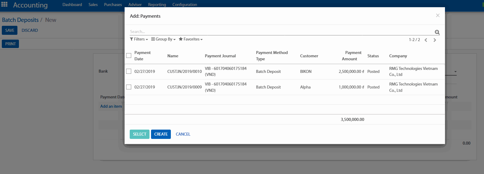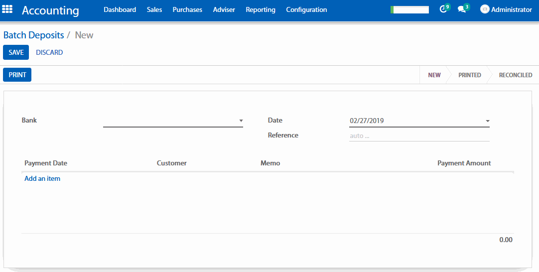 Từ ứng dụng kế toán, bạn hãy vào Sales (Bán hàng) > Batch Deposit, và tạo một Batch Deposit mới.