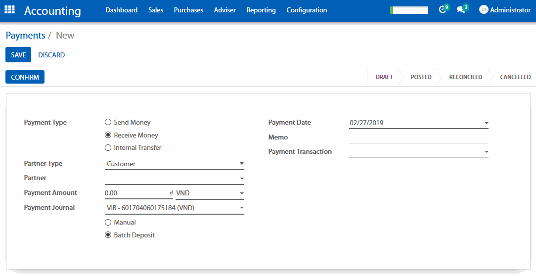 Nếu bạn chọn Batch Deposit trong trường các phương thức thanh toán, điều đó có nghĩa là các thanh toán được tạo trong sổ nhật ký này (được gọi là phương thức thanh toán khi bạn muốn thực hiện hoặc nhận một thanh toán) sẽ được áp dụng cho việc tạo các khoản tiền kí gửi sau đó.