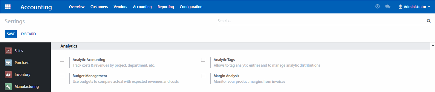 Nếu chúng ta cần lên ngân sách các chứng từ thanh toán và hóa đơn nhà cung cấp chính xác và cụ thể thì cần kích hoạt tính năng Kế toán phân tích. Nếu không thì chỉ có thể lên ngân sách tổng các tài khoản kế toán chung.