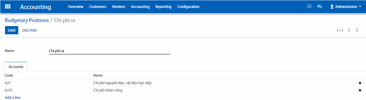 Để xác định các vị trí đó, đến mục Accounting (Kế toán) > Configuration (Cấu hình) > Budgetary Positions (Tài khoản ghi nhận ngân sách).