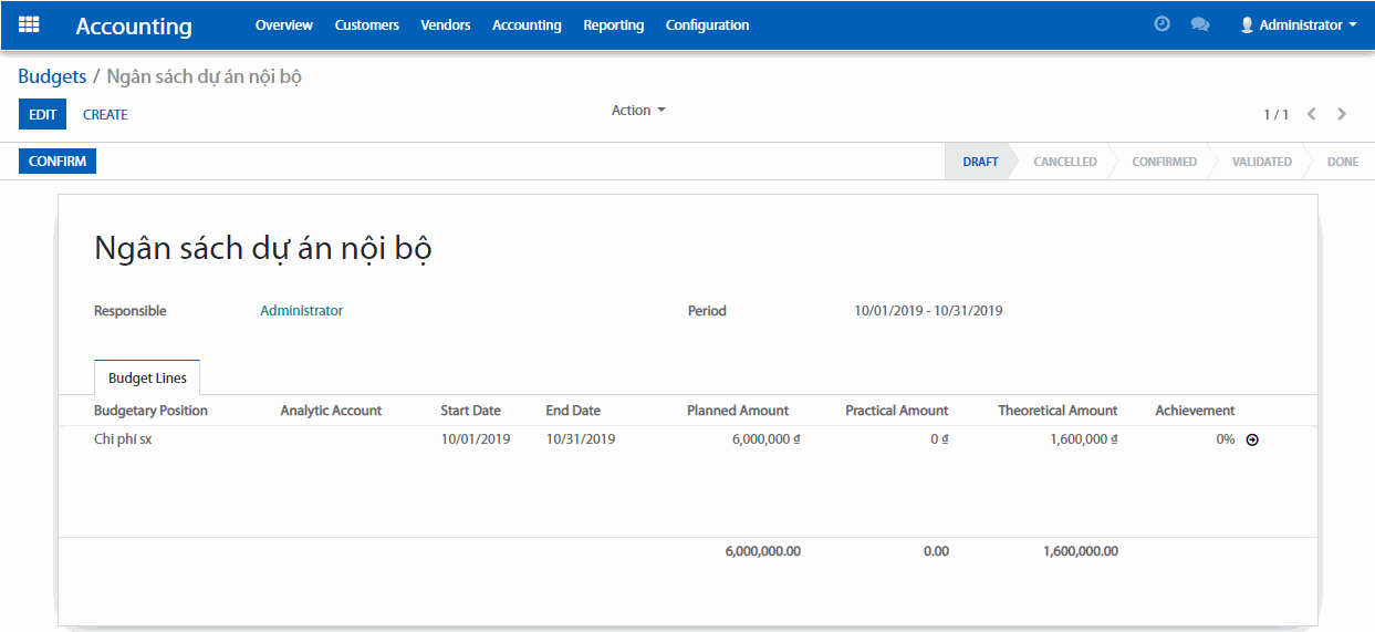 Để thiết lập mục tiêu trên, vào ứng dụng Kế toán, chọn Accounting (Kế toán) > Budgets (Ngân sách) và tạo ra một ngân sách mới.