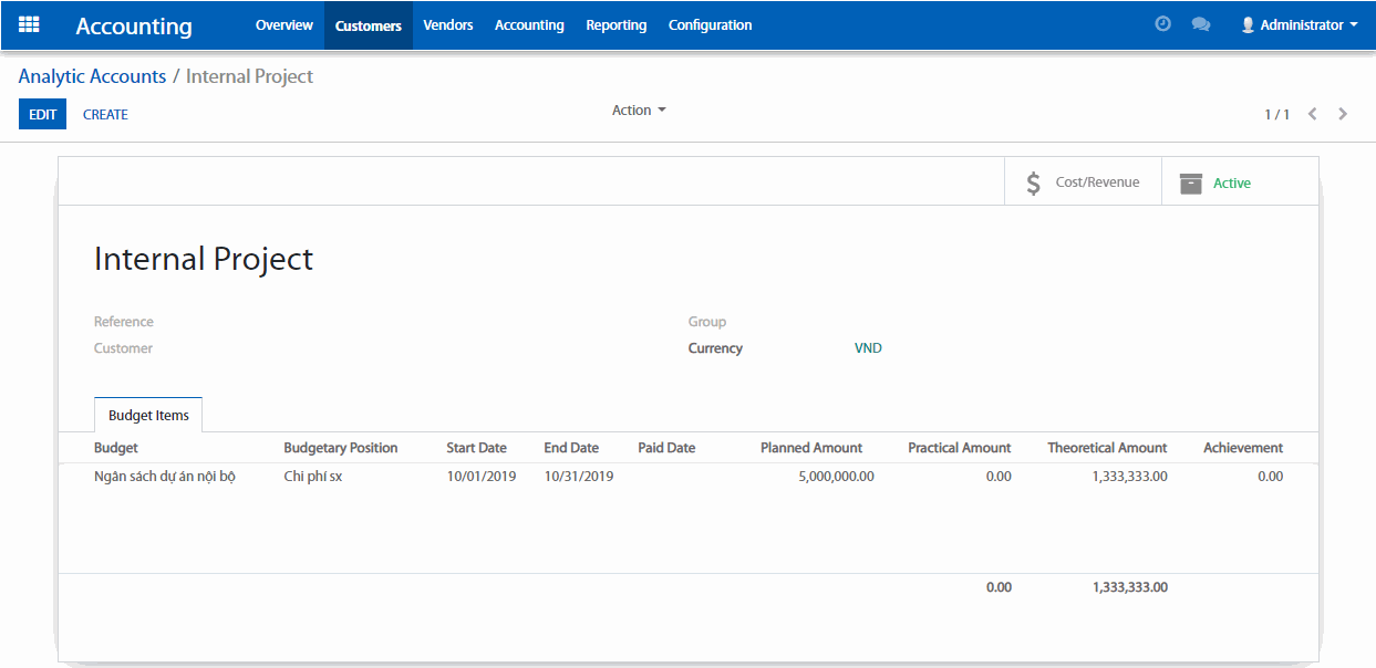 Nếu bạn muốn xác định cụ thể những chứng từ thanh toán hoặc hóa đơn nhà cung cấp cho ngân sách của bạn, bạn cần sử dụng kế toán phân tích. Phần mềm cần biết những chi phí có liên quan đến ngân sách được xác định. Để làm như vậy chúng ta cần liên kết hoá đơn và chi phí với tài khoản kế toán phân tích. Tạo một tài khoản kế toán phân tích bằng cách nhập vào mô-đun kế toán, sau đó nhấp vào Configuration (Cấu hình) > Analytic Accounts (Tài khoản quản trị) > Create (Tạo mới).