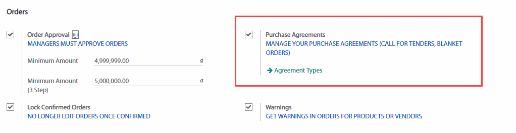Trong mô-đun Purchase (Mua hàng), mở menu Configuration (Cấu hình) và nhấp chọn vào Settings (Cài đặt). Trong mục Orders (Đơn hàng), chọn Purchase Agreements (Hợp đồng mua hàng) sau đó nhấn SAVE (LƯU).
