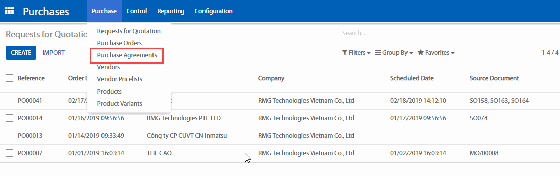 Để tạo Yêu cầu cung ứng mới, mở Purchase (Mua hàng) > Purchase Agreements (Thỏa ước mua hàng).