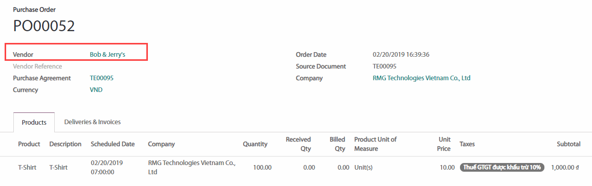 Trong trường Source Document (Tài liệu nguồn), bạn có thể chèn một PO tạo gần đây và dùng như một biểu mẫu.