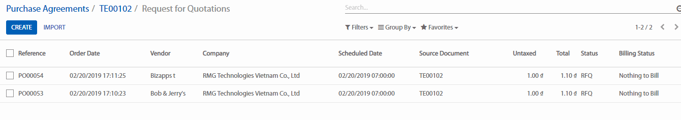 Danh sách các nhà cung ứng sẽ xuất hiện trong mục Requests for Quotation.