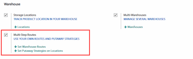Quy tắc thu mua là một phần của quy tắc xử lý kho. Đến ứng dụng Inventory (Tồn kho), Configuration (Cấu hình) > Settings (Thiết lập) tìm đến mục Warehouse (Kho hàng) và chọn Multi-Step Routes (Các Tuyến nhiều bước).