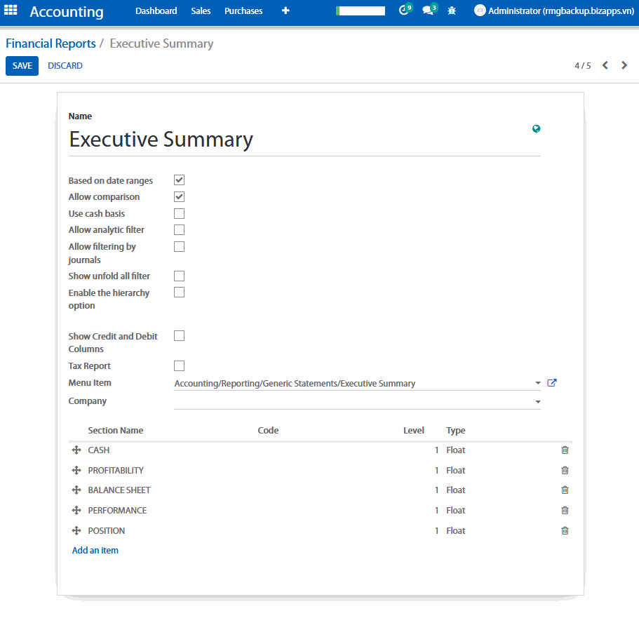 Vào menu Accounting (kế toán) > Configuration (cấu hình) > Financial Reports (báo cáo tài chính)