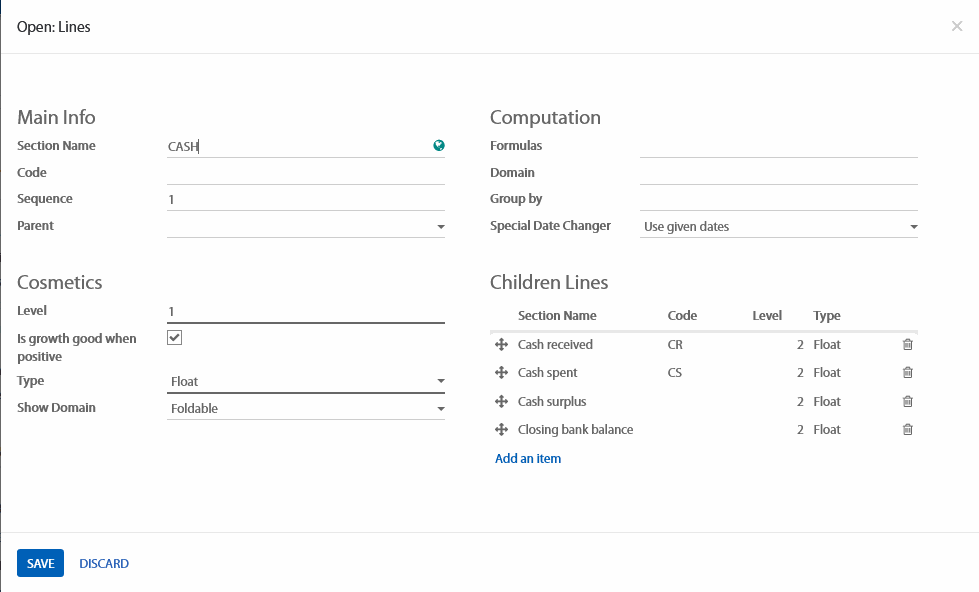 Sau khi đã tạo báo cáo, bạn cần điền vào các dòng thông tin chi tiết. Chúng cần nhập một tên, một mã số (dùng để tham chiếu đến dòng chi tiết), một chuỗi số và một cấp độ (để chuyển đổi dòng chi tiết)