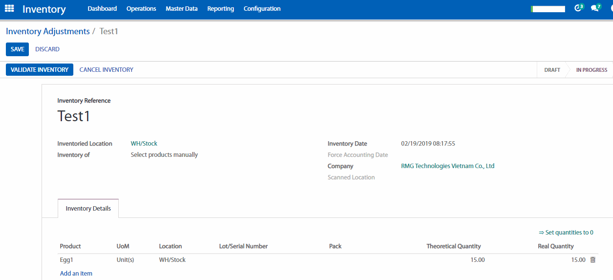 Sau đó chọn Validate Inventory để xác nhận hoàn thành điều chỉnh tồn kho cho sản phẩm.