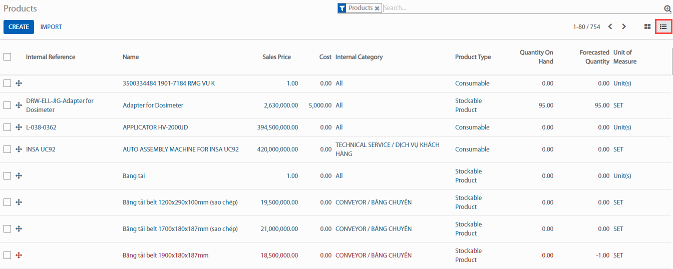 Để kiểm tra mức tồn kho hiện tại, đến mục Master Data (Dữ liệu gốc) > Products (Sản phẩm) và nhấp vào nút List (Danh sách)