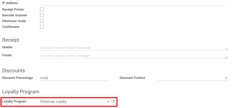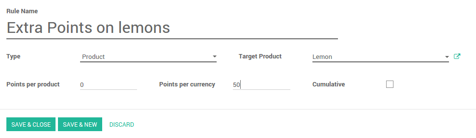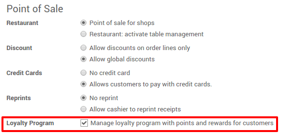 * Discount (giảm giá): tặng cho khách hàng một chiết khấu khi khách hàng tích lũy đến số điểm quy định. Cài đặt một sản phẩm với mức giá là 0 và không gồm bất kỳ khoản thuế nào