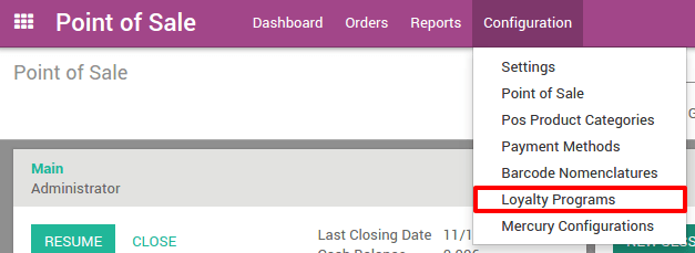Sau khi bạn đã hoàn thanh cấu hình, quay trở lại với menu Điểm bán lẻ -> Cấu hình -> Loyalty Programs và click Tạo (Create)