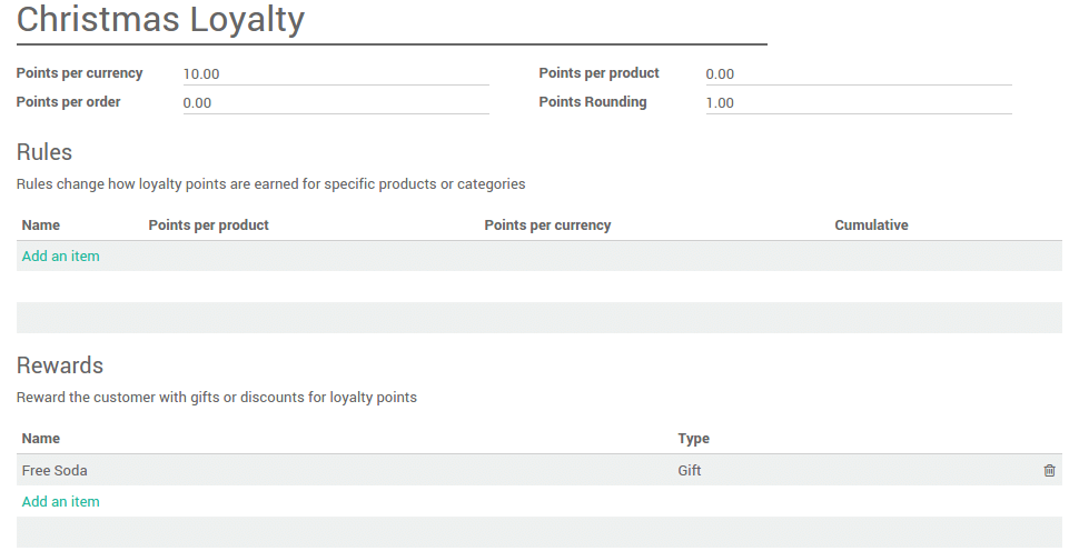 Quy định mới của bạn đã được tạo và phần thưởng cho khách hàng có thể được thêm bằng các nhấp vào “Thêm một mục” (Add an item) dưới Phần thưởng (Rewards)