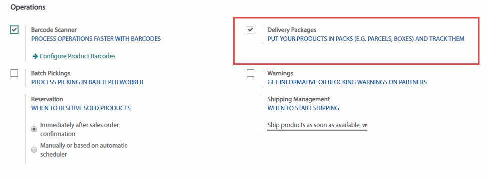 Trong Operations(Hoạt động), chọn Delivery Packages (Giao hàng theo gói) được sử dụng cho việc đóng gói: tấm kê hàng, thùng chứa hàng. Chọn SAVE (LƯU)