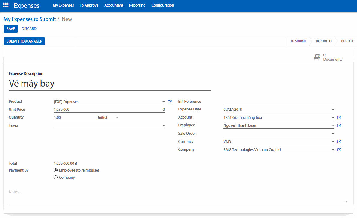 Mỗi nhân viên của công ty đều có thể tạo chi phí của họ từ ứng dụng Expenses (Chi phí) > My Expenses (Chi phí của tôi). Quy trình thanh toán chi phí cá nhân sẽ vận hành như sau: