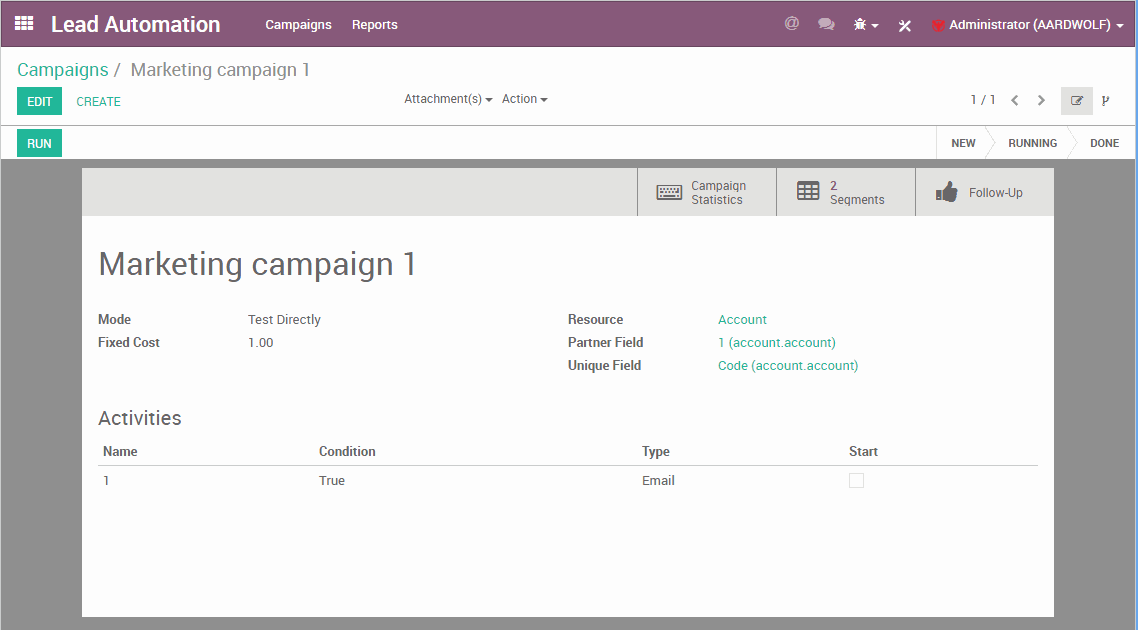Để giúp bạn dễ dàng thiết lập cho mình một chiến dịch marketing, trong phần mềm có sẵn một phân hệ có tên marketing_campaign_crm_demo. Sau khi cài phân hệ này lên, bạn sẽ có sẵn một bản dữ liệu demo cho một chiến dịch marketing.