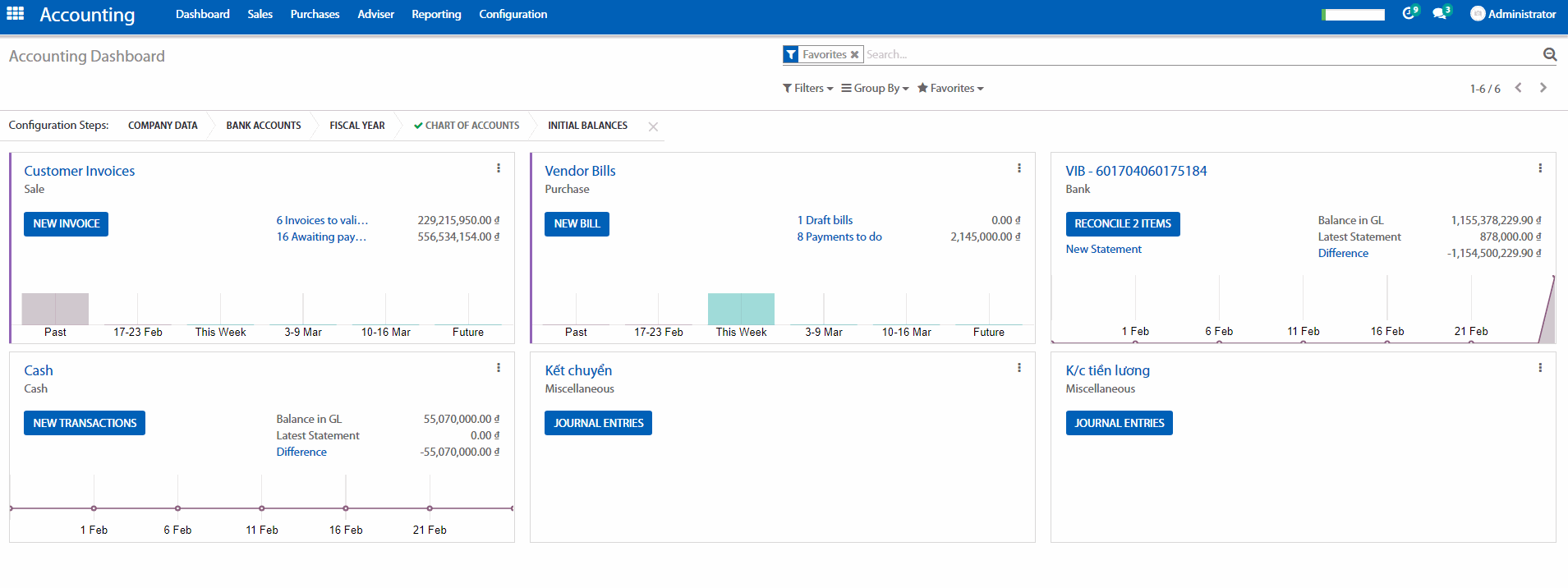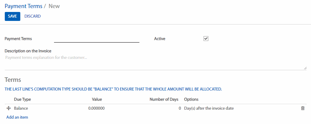 Để quản lý các khoản chiết khấu tiền mặt, chúng ta sử dụng khái niệm điều khoản thanh toán của phần mềm (từ phần mềm kế toán, chọn Configuration (Cấu hinh) > Management (Quản lý) > Payment terms (Điều khoản thanh toán) > Create (Tạo).