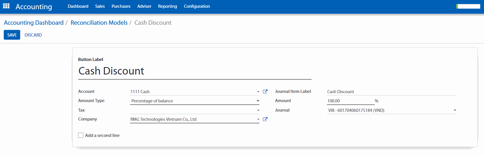 - Account: Chiết khấu tiền mặt ( tùy thuộc vào quốc gia)