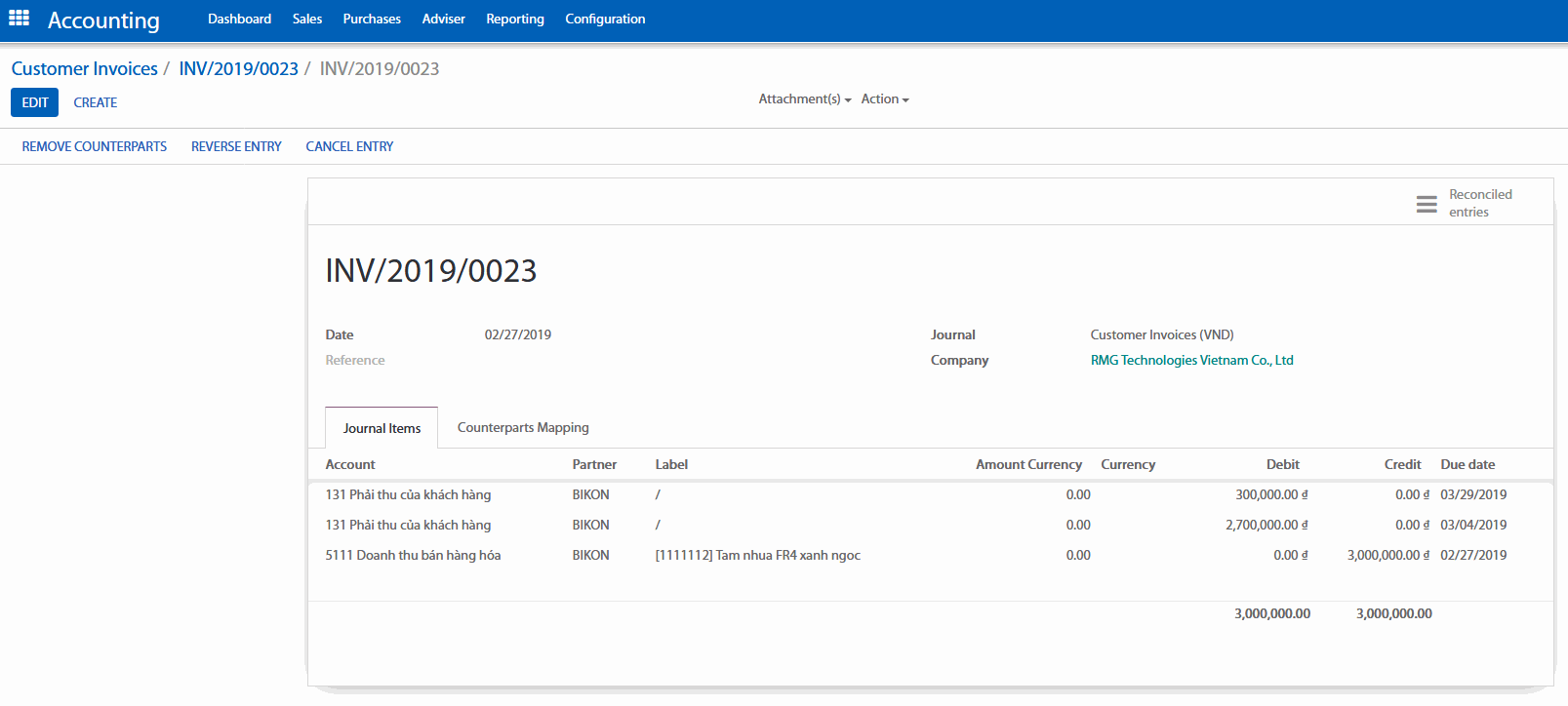 Khi hóa đơn được xác nhận, phần mềm sẽ tự động chia các khoản tiền phải thu trong điều mục bút toán với hai kỳ hạn khác ngày