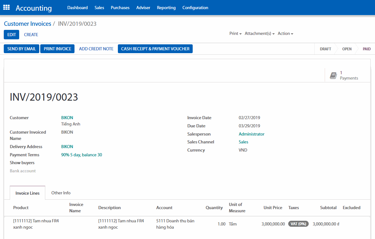 - Payment terms (điều khoản thanh toán): nhập vào tên điều khoản