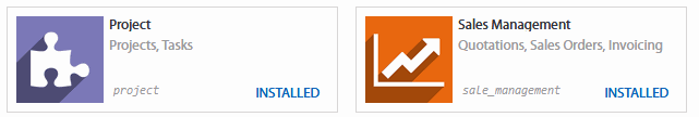 Để có thể tạo một nhiệm vụ từ đơn bán hàng, bạn cần cài đặt hai module là Quản lý bán hàng và Quản lý dự án. Bạn hãy đi đến menu Ứng dụng trong menu Thiết lập để tiến hành kiểm tra và cài đặt chúng
