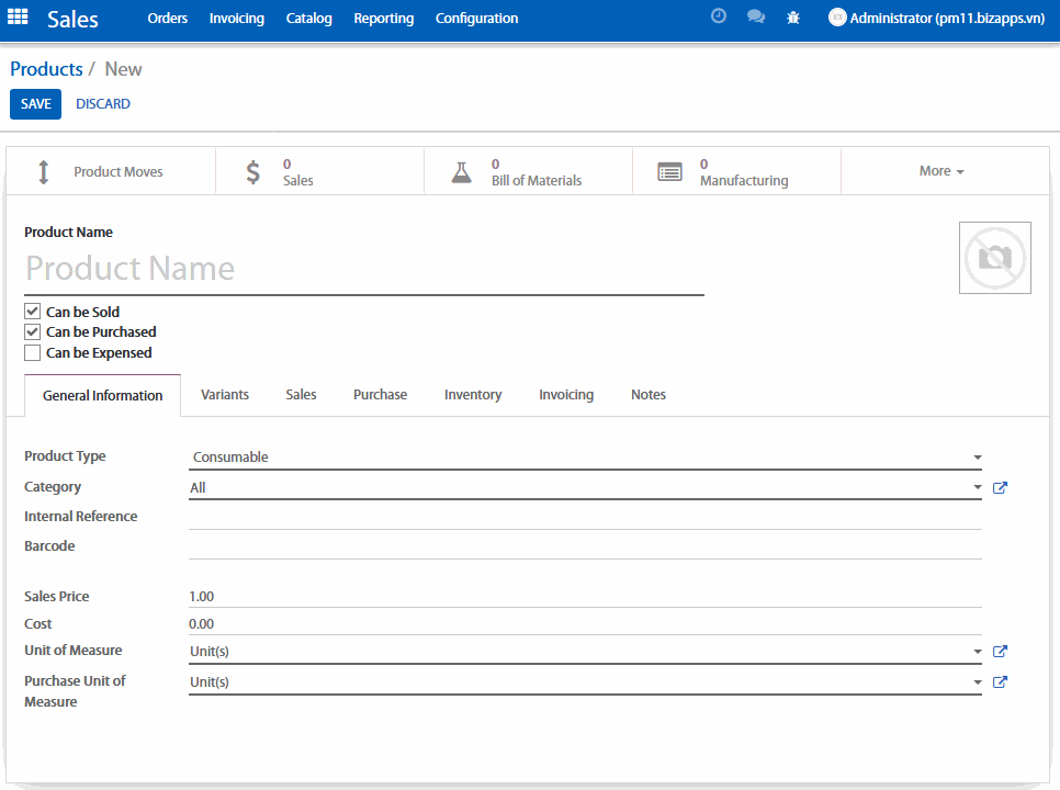 Bạn cần phải cấu hình dịch vụ của bạn trên form sản phẩm để bản thân nó có thể tạo ra một nhiệm vụ mỗi khi nó được bán. Từ module Sale (Bán hàng) > Product (Sản phẩm) và tạo ra một sản phẩm theo các thông tin dưới đây: