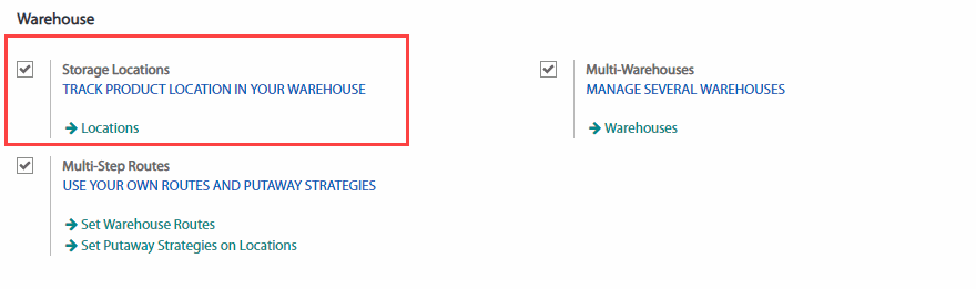 Đầu tiên, bạn cần chọn tùy chọn đa địa điểm. Đến ứng dụng Inventory (Tồn kho), Configuration (Cấu hình) > Settings (Thiết lập) tìm đến mục Warehouse (Kho hàng) và chọn Storage Locations (Các địa điểm kho). Đừng quên SAVE (LƯU) các thay đổi của bạn.