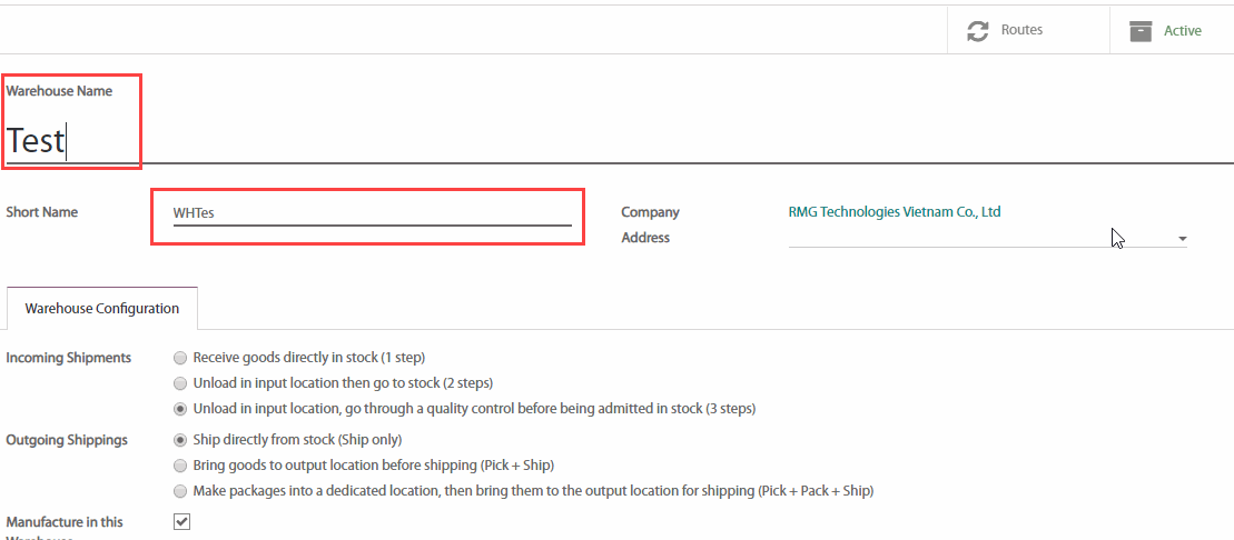 Điền vào Warehouse Name (Tên kho hàng) và Short Name (Tên viết tắt). Tên ngắn bao gồm tối đa 5 ký tự.