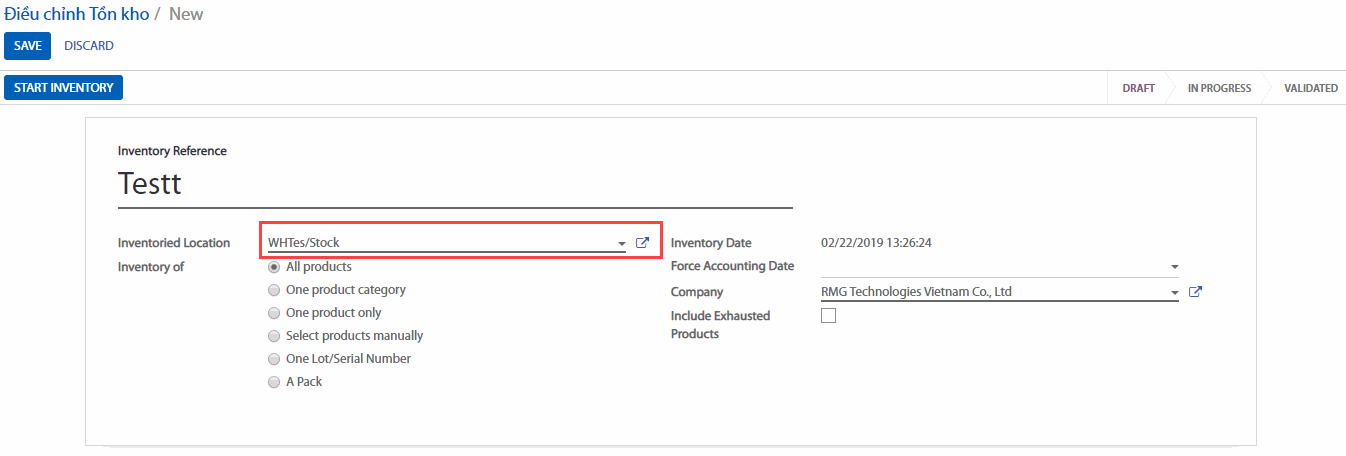 Đến ứng dụng Kho, Operations (Hoạt động) > Inventory Adjustment (Điều chỉnh tồn kho). Sau đó bạn có thể tạo ra 1 kho mới bằng cách nhấp vào Create (Tạo). Điền vào Inventory Reference (Tham chiếu kiểm kê), Date (Ngày) và phải đảm bảo rằng chọn đúng nhà kho và địa điểm,