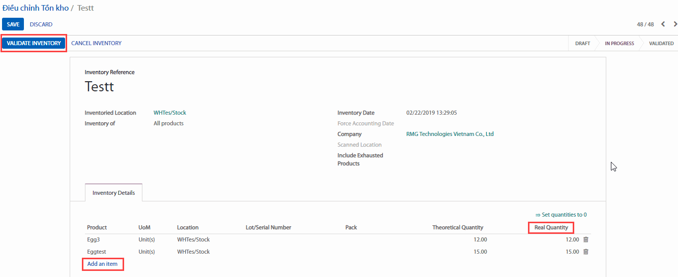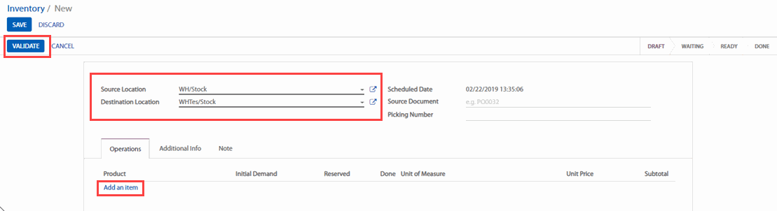 Thêm sản phẩm mà bạn muốn luân chuyển bằng cách nhấp vào Add an Item (Thêm một hạng mục) và đừng quên Validate (Xác nhận) hoặc Mark as TODO khi bạn đã thực hiện xong.