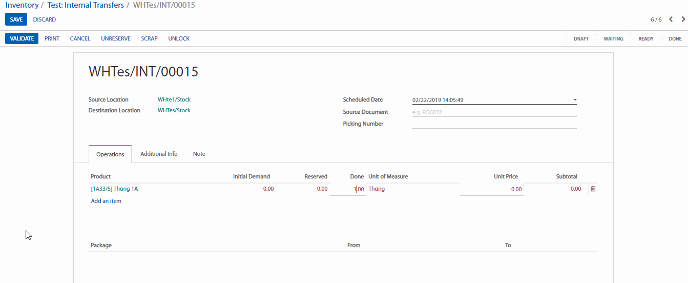 Nếu chọn Validate (Xác nhận) thì Phần mềm sẽ để đánh dấu trạng thái luân chuyển là Waiting Availability. Nhấp vào để lưu trữ số lượng sản phẩm trong kho nguồn của bạn.