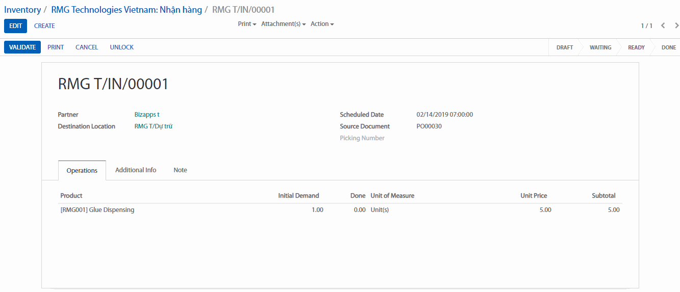 Để xử lý việc chuyển kho hàng. Cách đơn giản là nhấn vào nút VALIDATE (Xác nhận) để hoàn thành việc giao hàng. Nếu bạn muốn xử lý cả đơn hàng, một tin nhắn sẽ gửi đến bạn, để chấp nhận thì nhấn nút APPLY (ÁP DỤNG) .