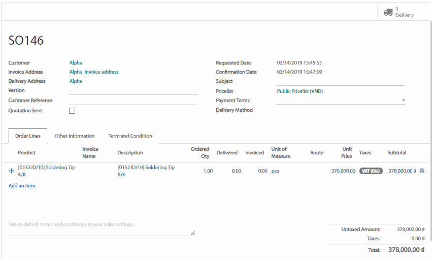 Nhấn vào nút Delivery (Giao hàng) ở trên bên phải của đơn bán hàng.